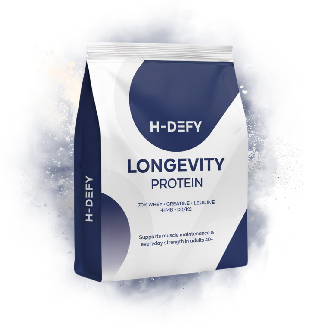 Most protein powders are designed for younger adults with naturally responsive muscles. H-DEFY™ is built for 40+ biology — combining 30 g of premium whey protein with clinically effective doses of leucine, HMB, and creatine to overcome anabolic resistance, rebuild muscle, and slow age-related decline.